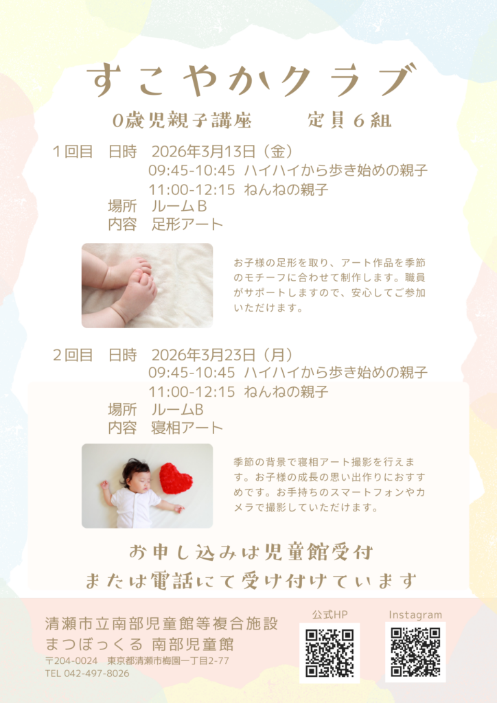 | 開催日時 | 第1回:3月13日(金) ①09:45~10:45 ハイハイから歩き始めの親子 ②11:00~12:15 ねんねの親子 第2回:3月23日(月) ①09:45~10:45 ハイハイから歩き始めの親子 ②11:00~12:15 ねんねの親子 |