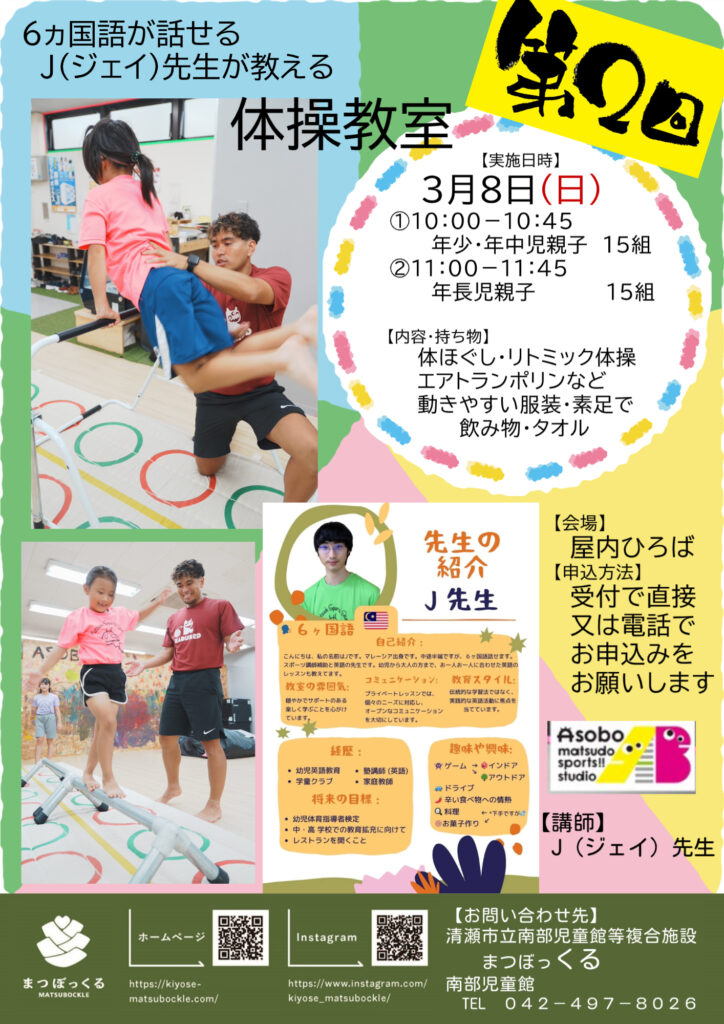 6か国語を話すマレーシア人のJ先生が、体ほぐしや英語でリトミック、エアトランポリンなどで、親子で楽しめる体操教室