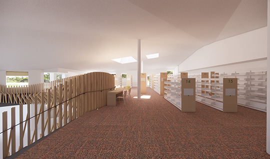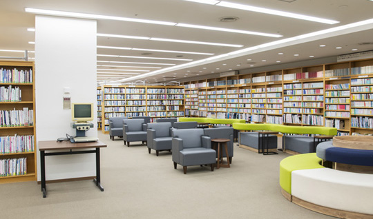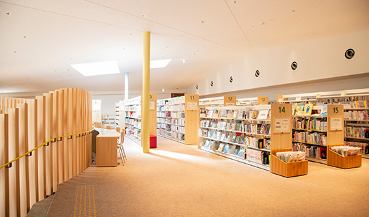 「まつぼっくる」の中にある約4万冊を蔵書とする図書館です。調べものや作業に適したカウンターデスク。気軽な読書の場として利用できる多目的スペース。