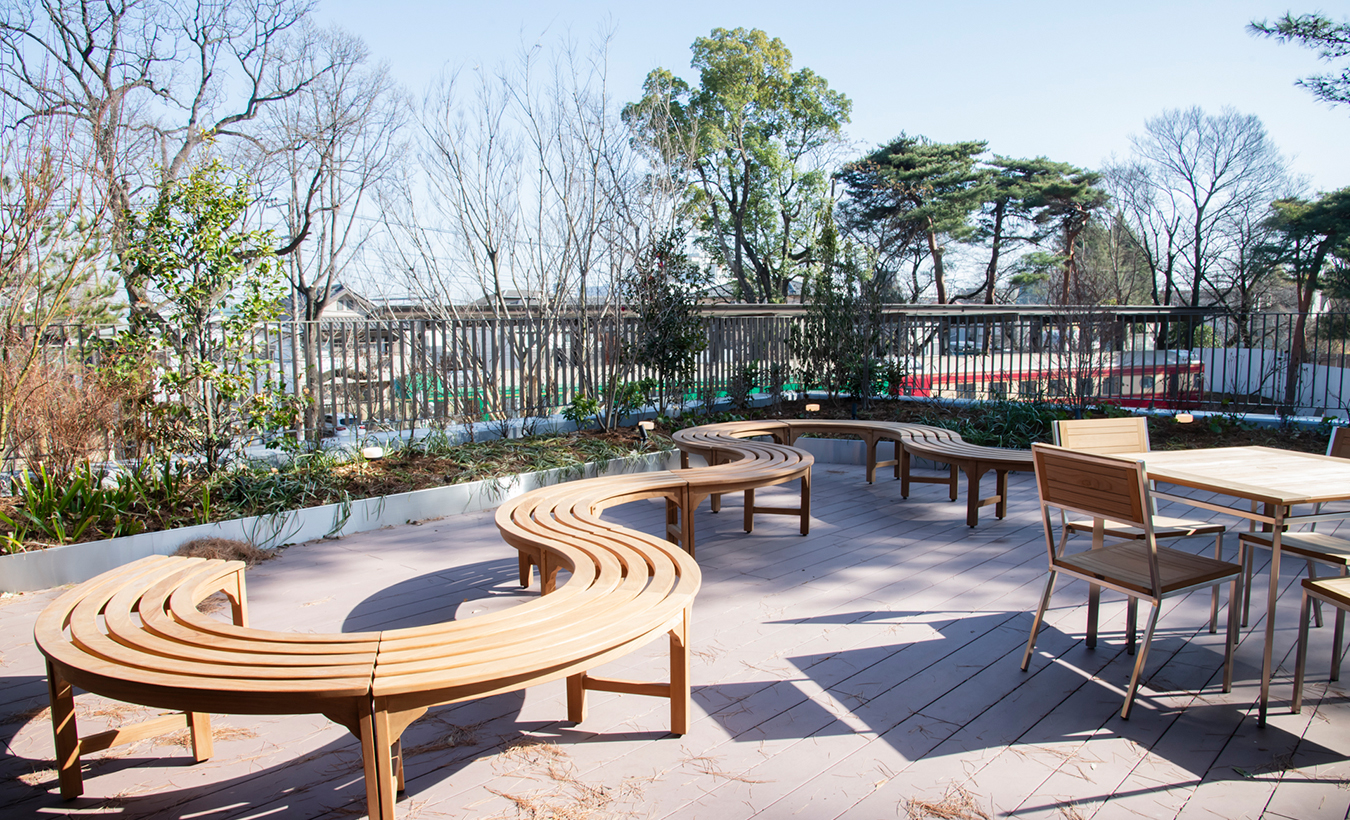 自然の光や風を感じながら読書を楽しむことのできるテラス席があり、多様な読書を提供します。