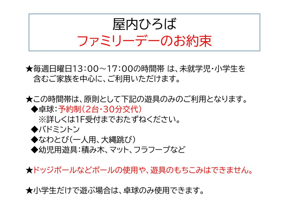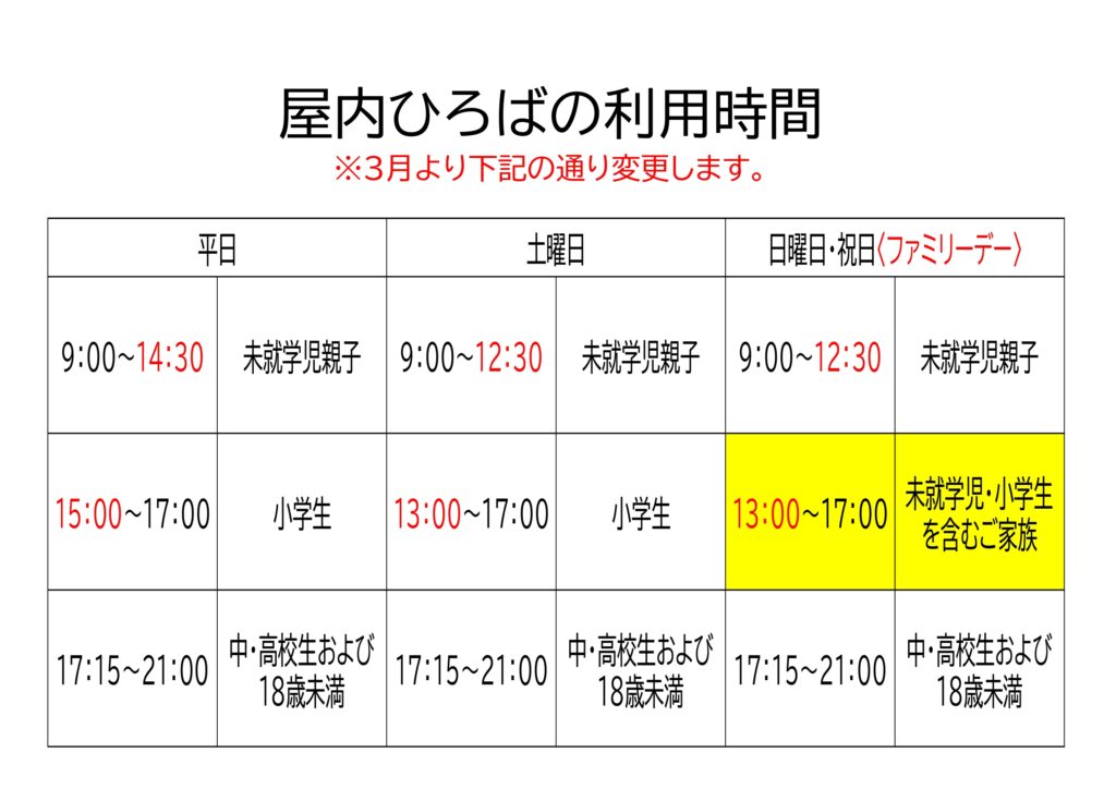 3月より、毎週日曜日・祝日の13:00~17:00は未就学児・小学生を含むご家族を中心にご利用いただける「ファミリーデー」となります。